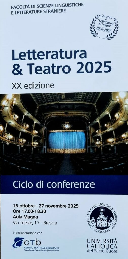 «Da parte nostra l’intenzione principale è quella di rilanciare lo studio della letteratura ottenendo un positivo riscontro da parte dei giovani e in particolare dei nostri studenti» aggiunge subito dopo. «Nonostante i comprensibili dubbi iniziali ci siamo resi subito conto della grande affluenza che premiava ogni evento e, attraverso la rassegna; rinsaldava la collaborazione tra Università Cattolica e C.T.B. con sette incontri (tra cui tre anglofili, due italiani, un classico e quello di cui ci stiamo per occupare. Per conferite maggior risalto a questo ventesimo anniversario abbiamo pensato di invitare (13 novembre) l’ecletticissimo Luca Micheletti che terrà una conferenza sul tema Invenzioni, scritture, metamorfosi. Dalla storia alla scena, centrata proprio sul rapporto tra letteratura e teatro».