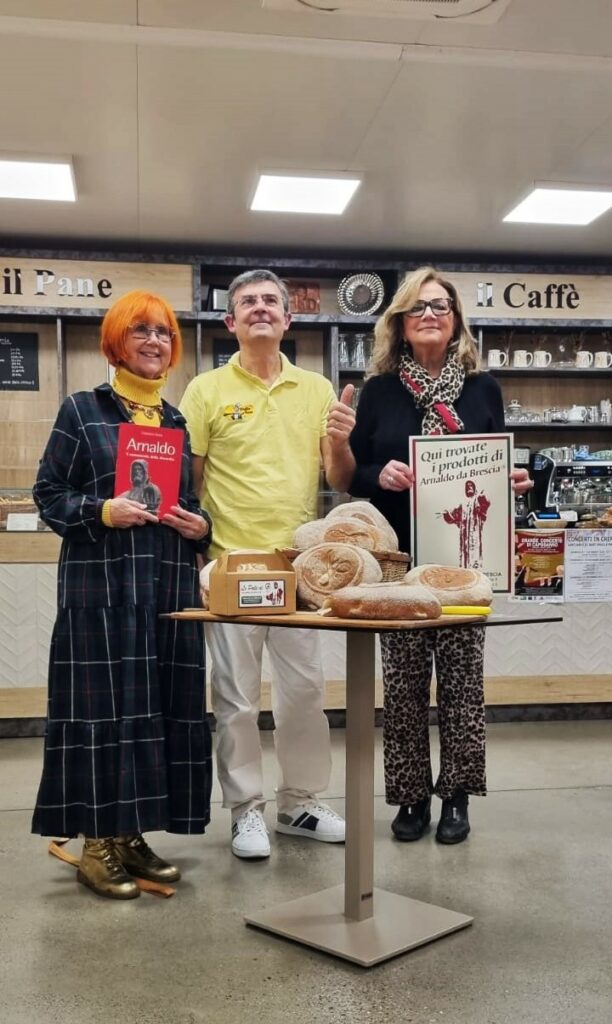 «Dopo oltre venticinque anni, torniamo a presentare prodotti di panetteria ispirati ad Arnaldo come già fatto nel 2000 per valorizzare la memoria del grande eretico che dà il nome alla nostra azienda» sono le parole con le quali Roberta Morelli apre il dibattito. «A differenza di allora, però, invece che su un consorzio di botteghe, abbiamo puntato soltanto su quella di Armando Guerini, un’autentica eccellenza cittadina del settore, affidandogli in esclusiva il marchio di Arnaldo».