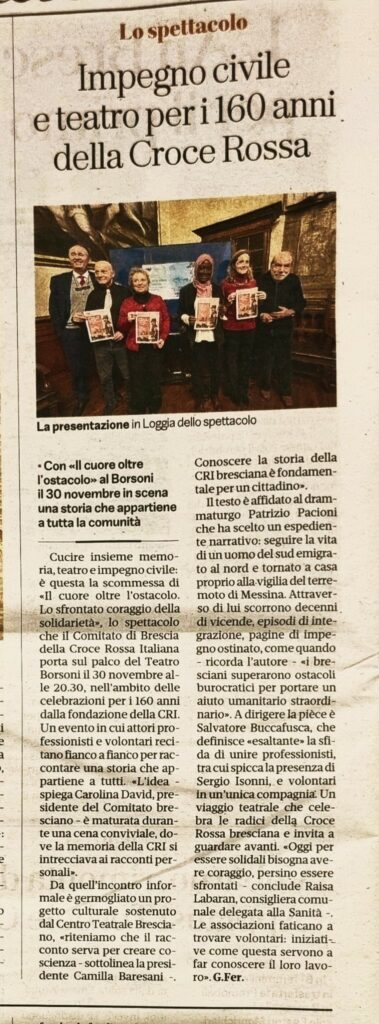 L’opera, scritta da Patrizio Pacioni per la regia di Salvo Buccafusca (coadiuvato da Elena Marrone) , è stata prodotta e allestita in collaborazione tra la sede bresciana della Croce Rossa Italiana, l’Associazione Le ombre di Platone e il C.T.B. Centro Teatrale Bresciano, uno dei più importanti player della prosa nazionale.