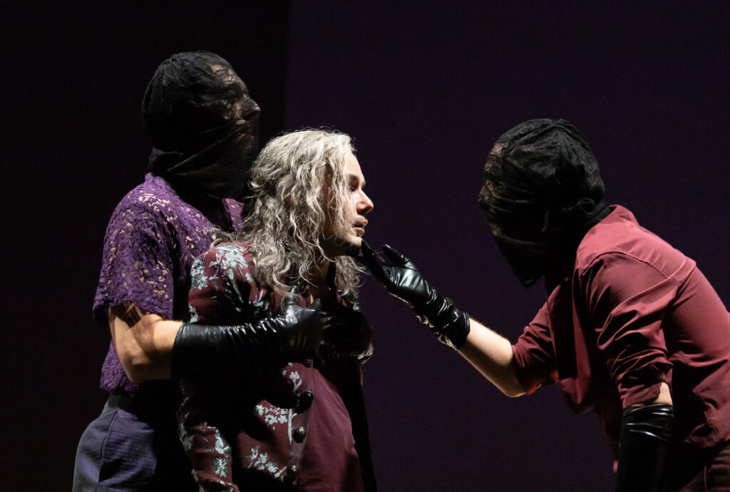 Interessante e suggestiva l’interpretazione da parte della regia che, nell’assoluto rispetto della parola e dello spirito del testo originale, lo attualizza come si è detto ricorrendo alla scelta non convenzionale di una scenografia- non scenografia. Bastano due tavoli e qualche sedia, unitamente al sapiente uso di luci e suoni, per circoscrivere un ambiente rarefatto e claustrofobico che, pur rimanendo astratto nel tempo e nello spazio, trasporta e mantiene lo spettatore nell’atmosfera sinistra del periodo più tragico della storia britannica.